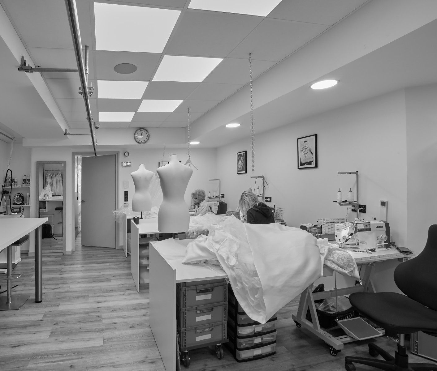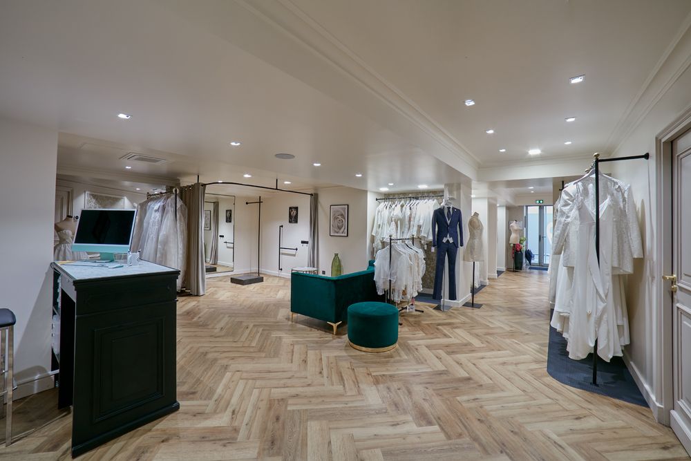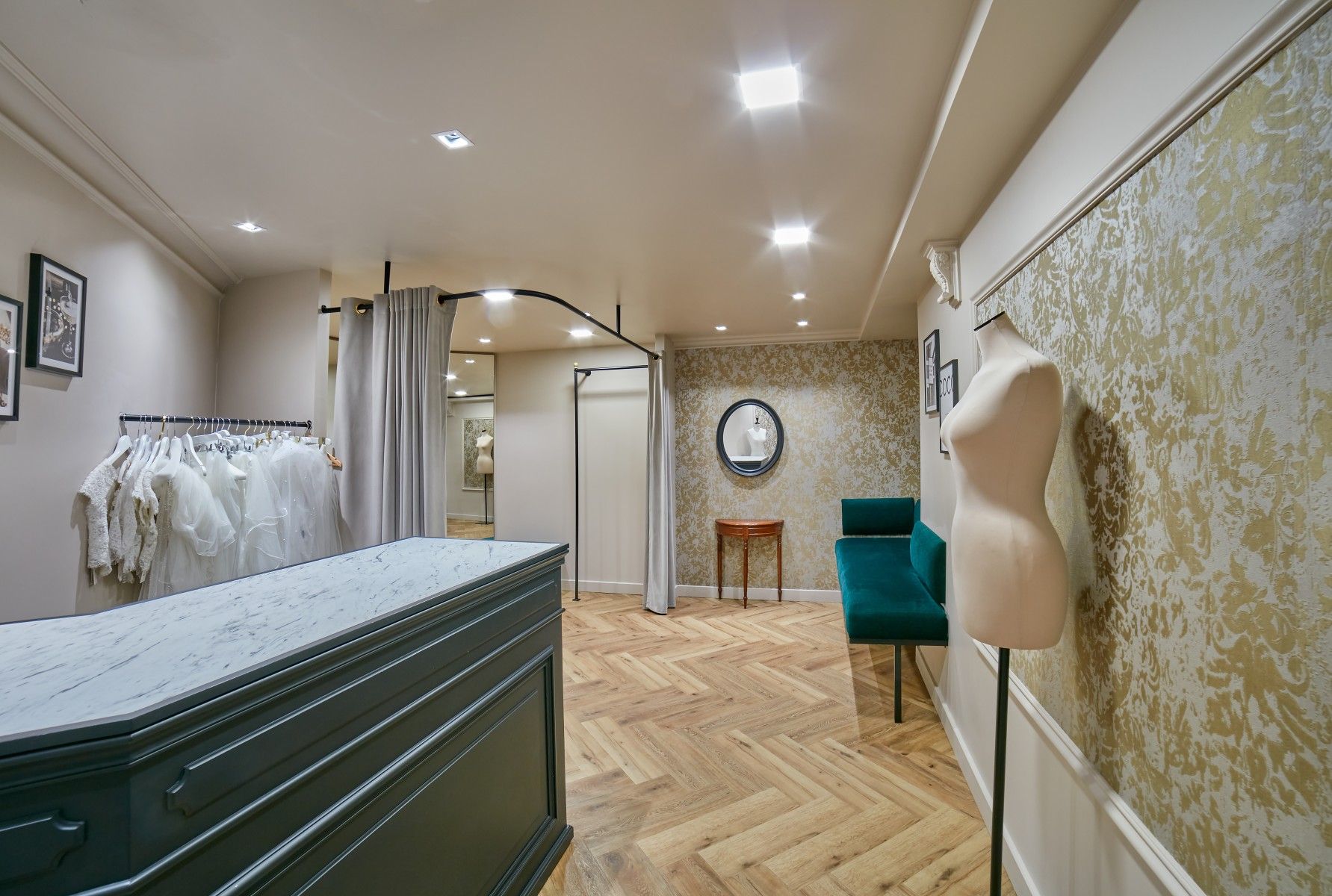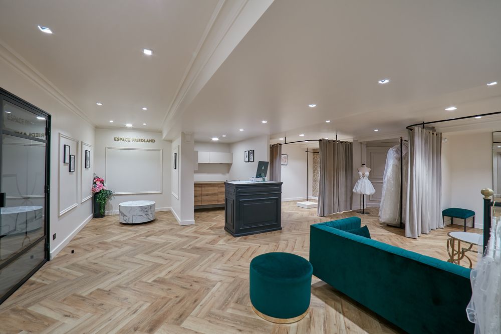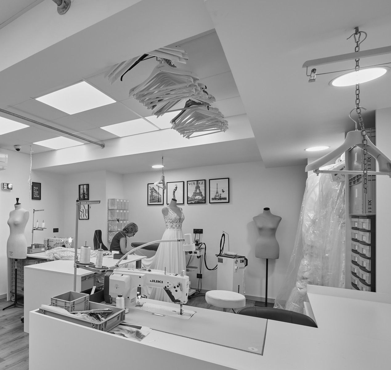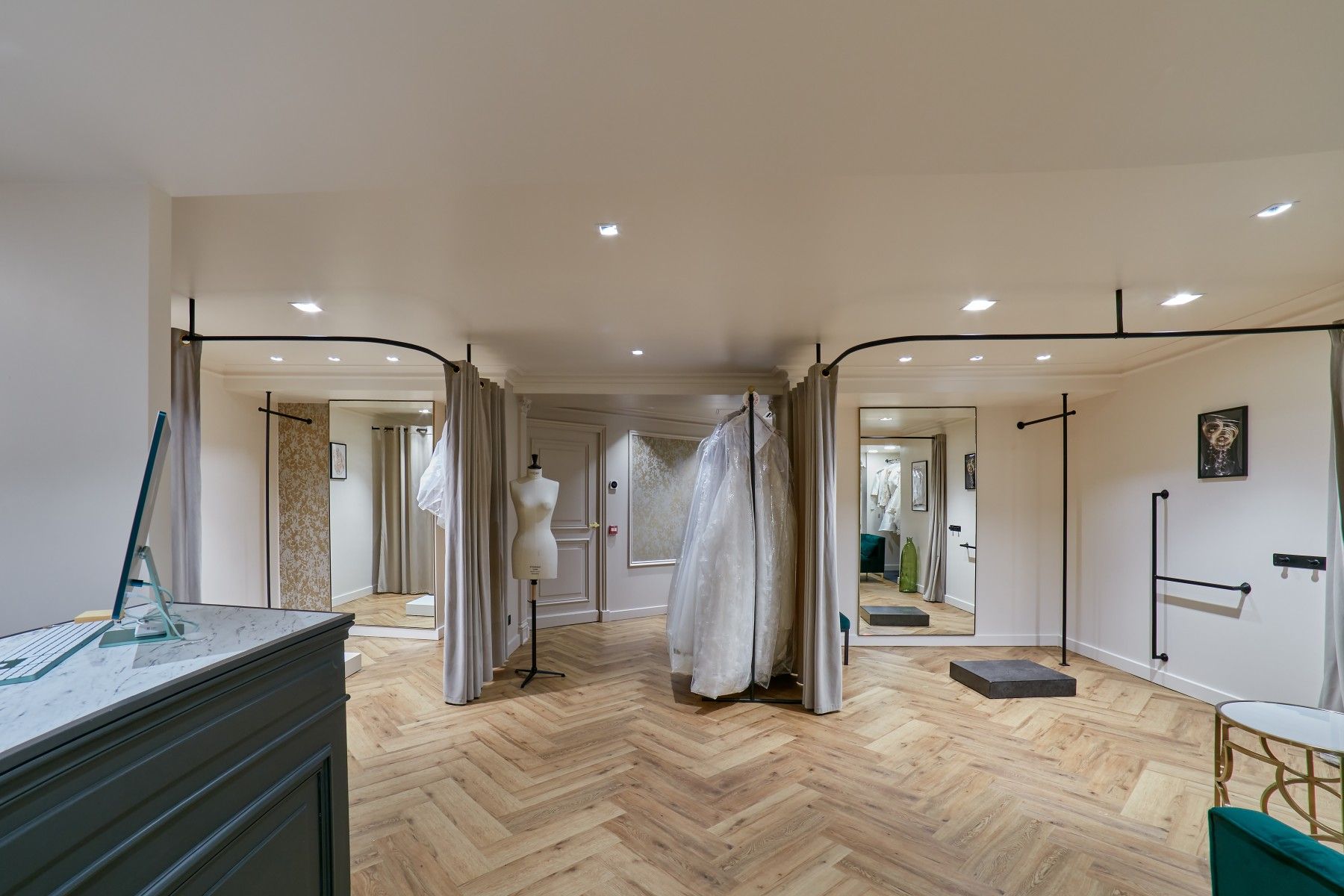 Il s’agit d’un local d’activités livré brut à rez-de-chaussée d’un immeuble d’habitations. L’étroite collaboration avec le maître d’ouvrage et l’architecte d'intérieur a permis de réaliser ce show-room polyvalent de plus de 200 m2, composé de plusieurs espaces dédiés à l’univers de créateurs de robes de mariées: ateliers de couture, réserve de stockage, cabines d’essayage, espaces de vente, mais pouvant aussi accueillir ponctuellement des évènements, des truck show ou des ventes privées.
